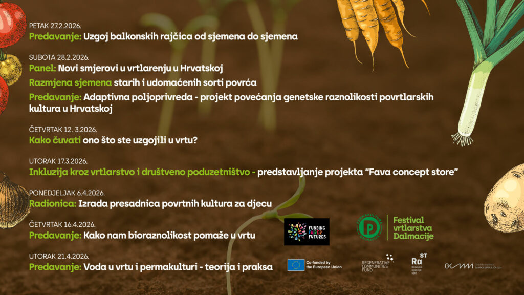 Pripremili smo bogat program koji obuhvaća sve – od uzgoja na balkonima i očuvanja starih sorti, do inkluzivnih projekata i radionica za najmlađe. Stručnjaci iz raznih krajeva Dalmacije i Hrvatske će dijeliti svoja znanja iskustva kako bi vas inspirirali i motivirali za novu vrtlarsku sezonu. Bez obzira imate li veliki povrtnjak ili samo jednu teglicu na prozoru na Festivalu ćete sigurno pronaći nešto za sebe.